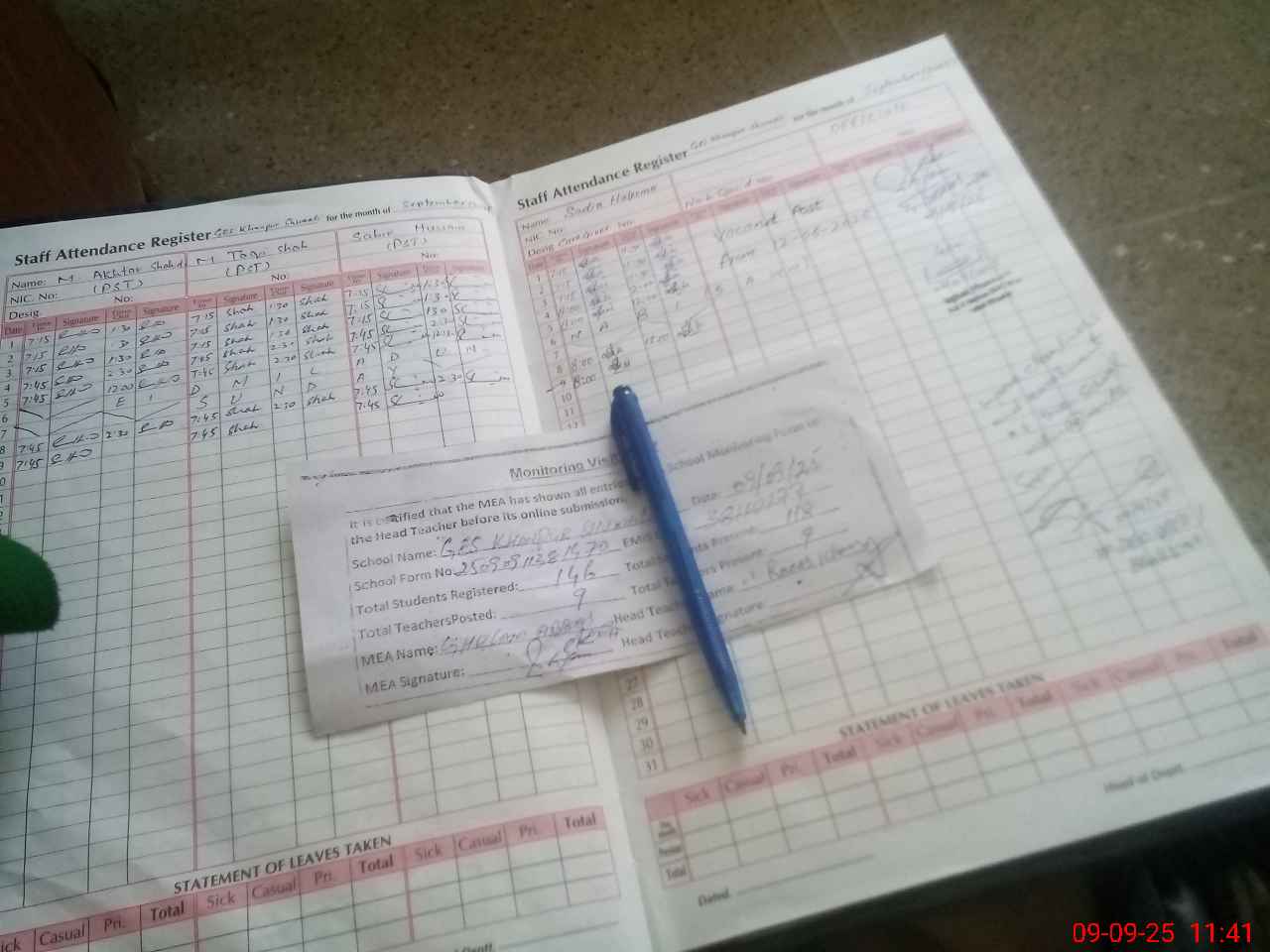 | Attendance Register | Head Teacher | MEA with School | Visit Proof |