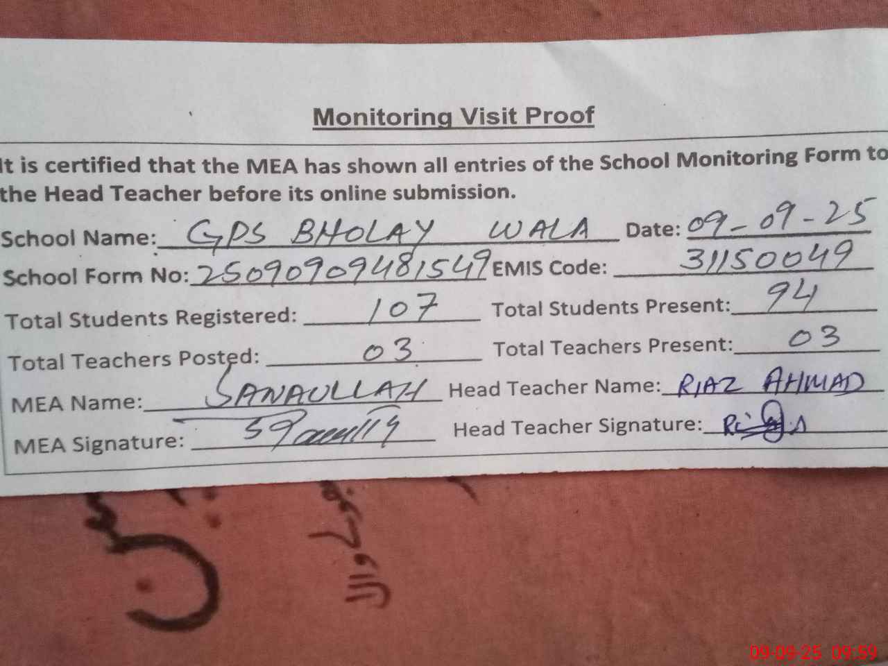 | Attendance Register | Head Teacher | MEA with School | Visit Proof |