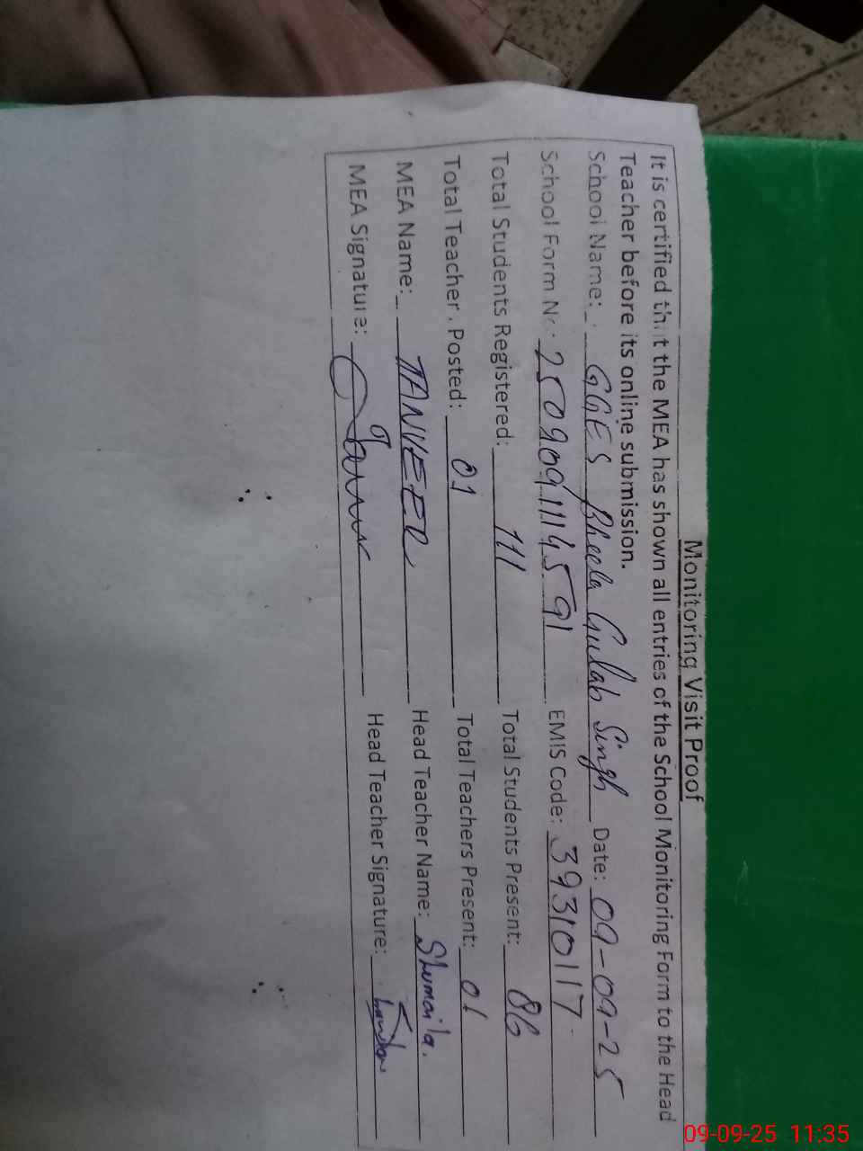 | Attendance Register | Head Teacher | MEA with School | Visit Proof |