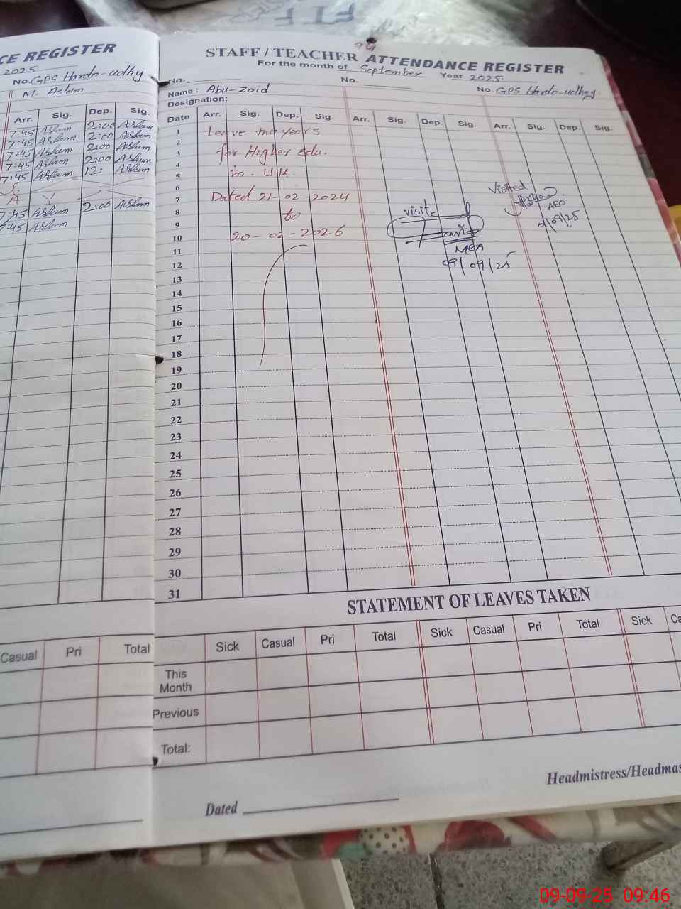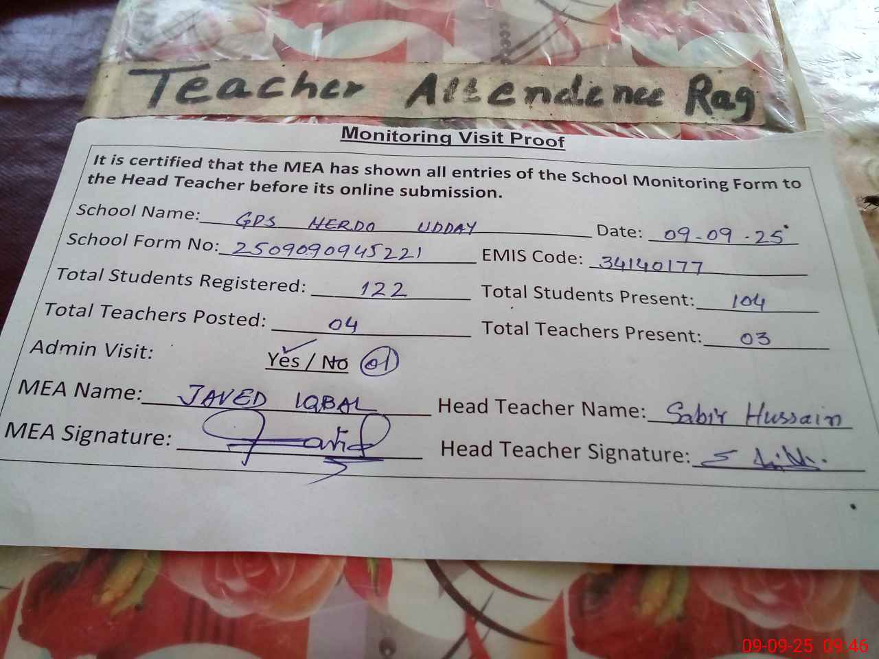 | Attendance Register | Head Teacher | MEA with School | Visit Proof |