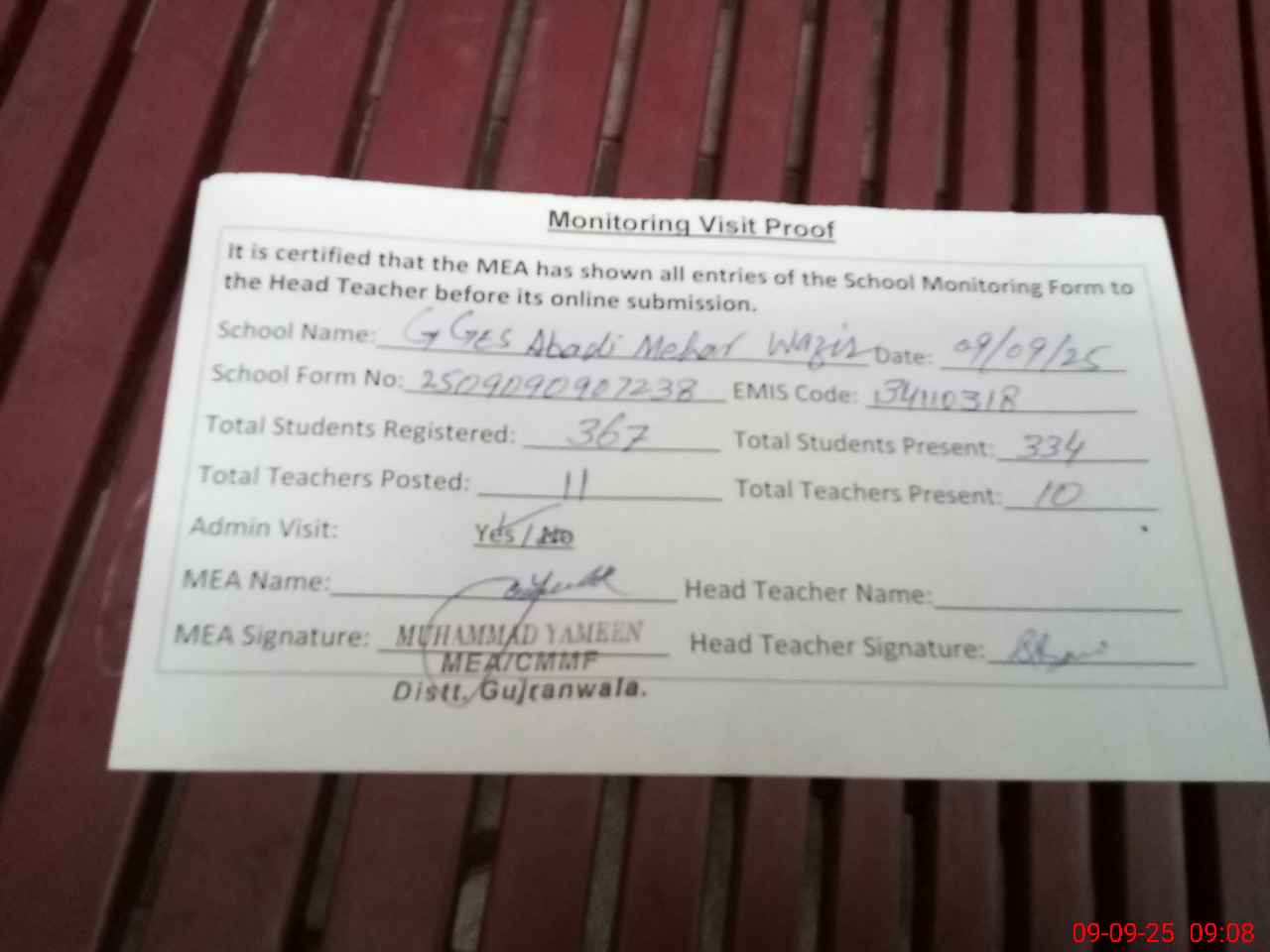 | Attendance Register | Head Teacher | MEA with School | Visit Proof |