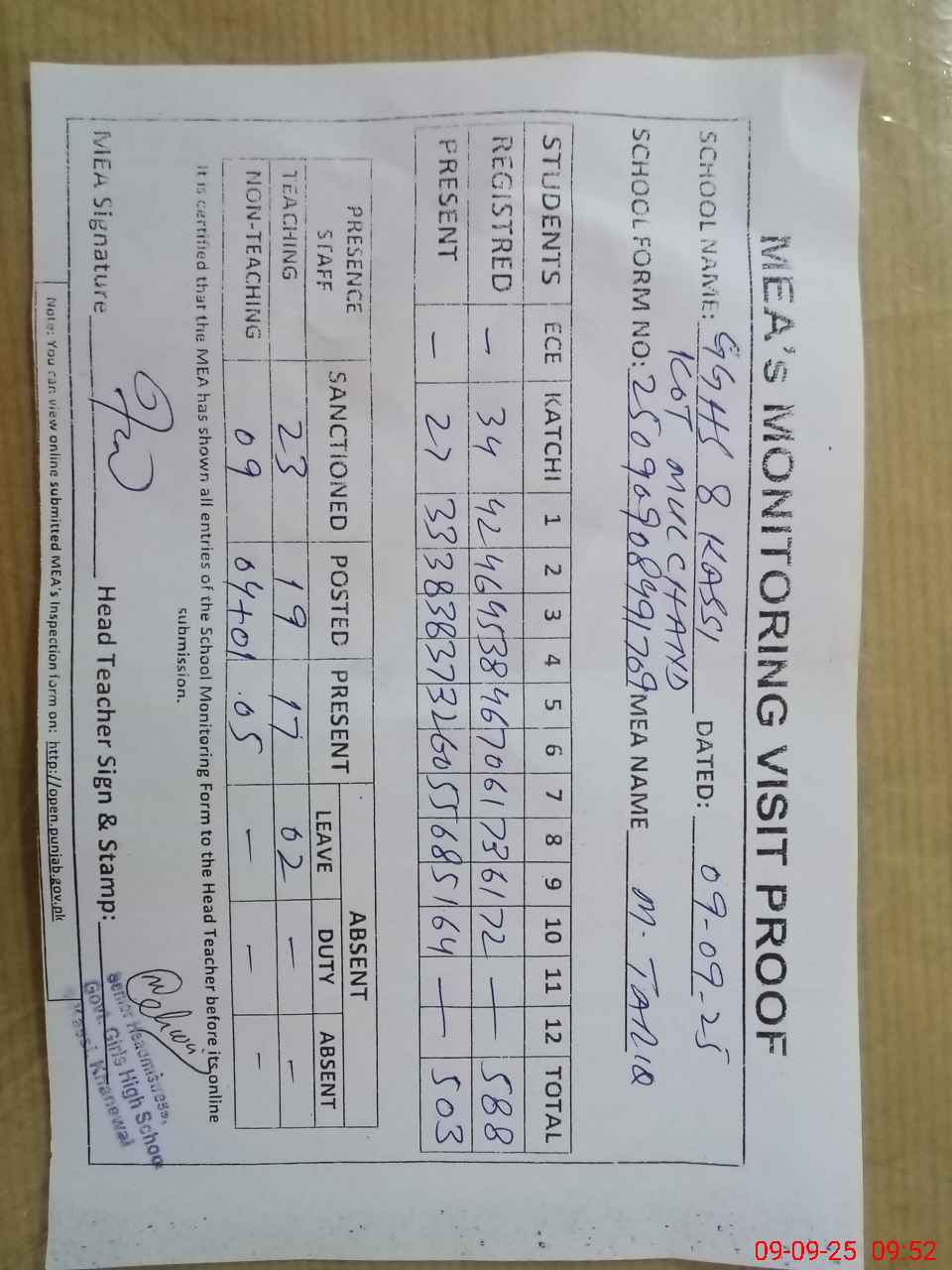| Attendance Register | Head Teacher | MEA with School | Visit Proof |