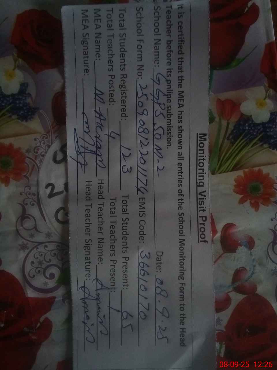 | Attendance Register | Head Teacher | MEA with School | Visit Proof |