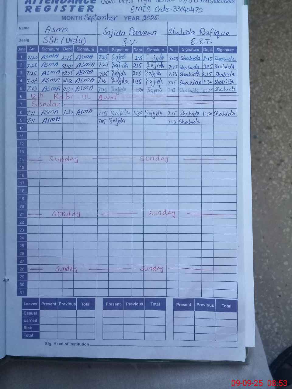| CNIC | Full Name | Designation | R/C | Absence During Last Calender Month |