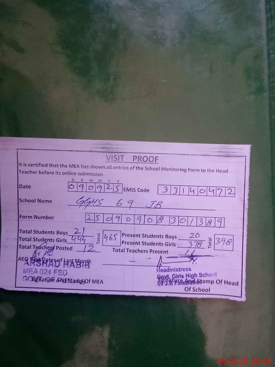 | Attendance Register | Head Teacher | MEA with School | Visit Proof |