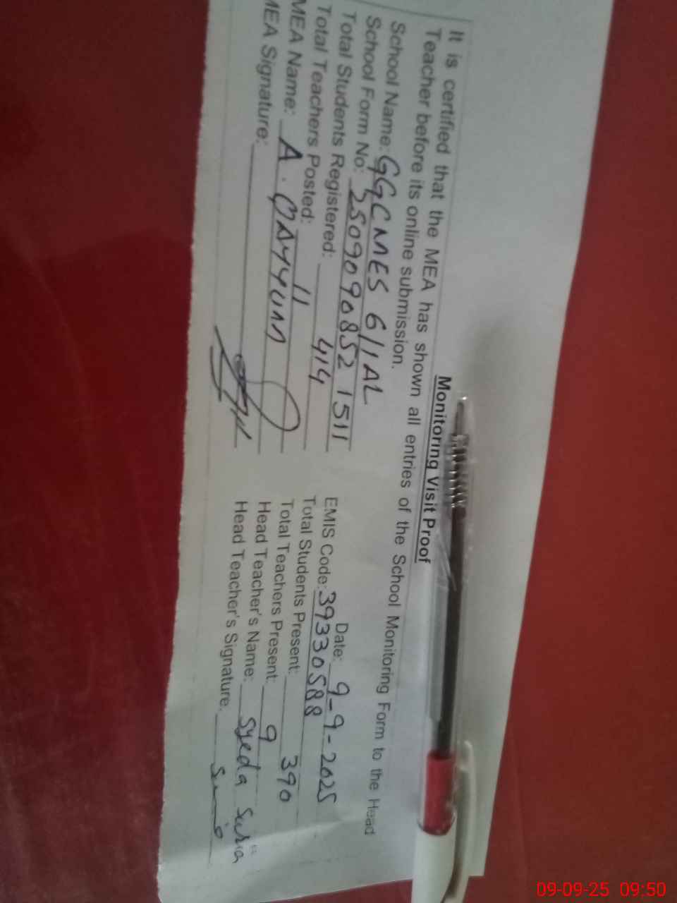 | Attendance Register | Head Teacher | MEA with School | Visit Proof |