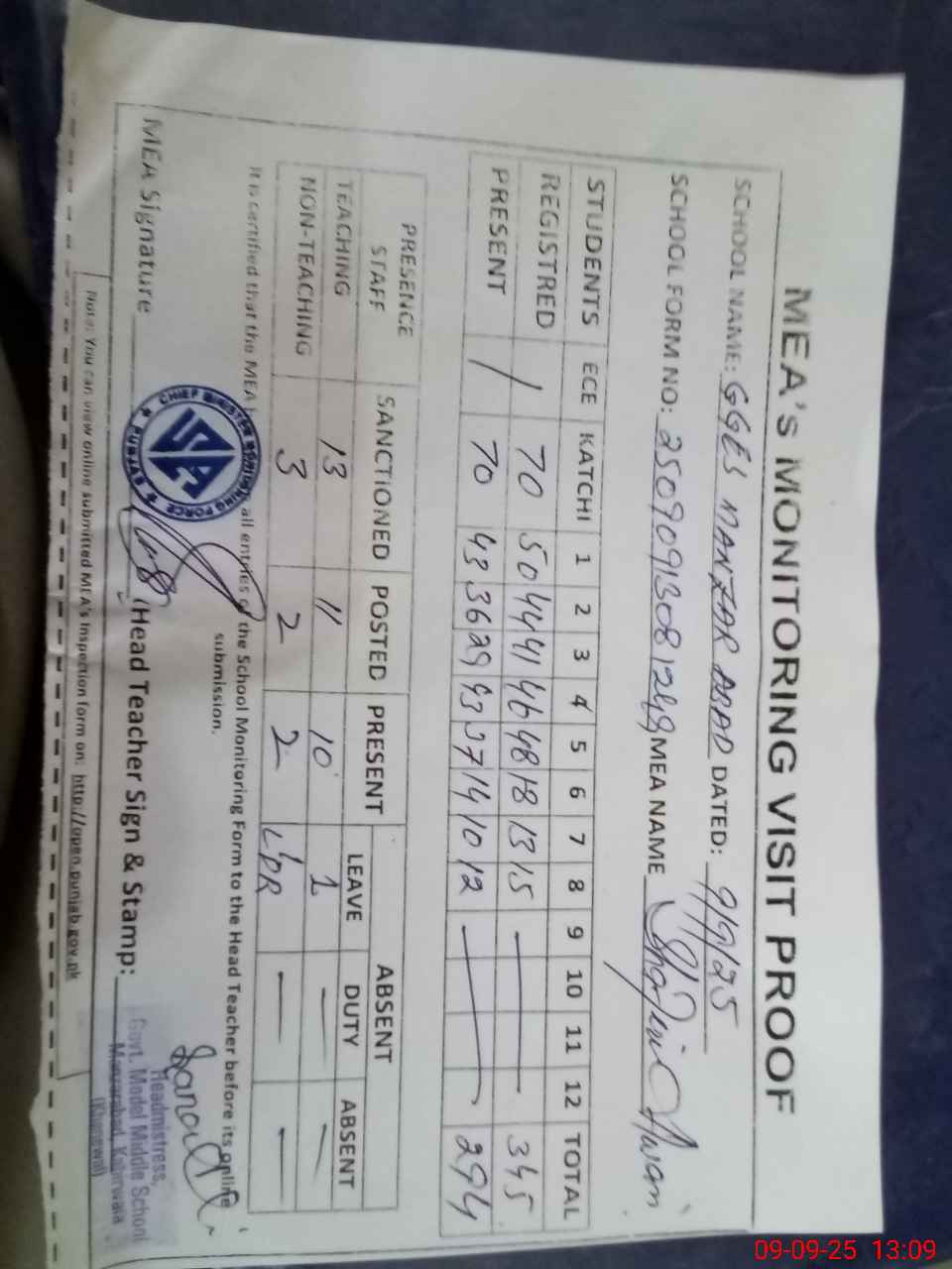 | Attendance Register | Head Teacher | MEA with School | Visit Proof |