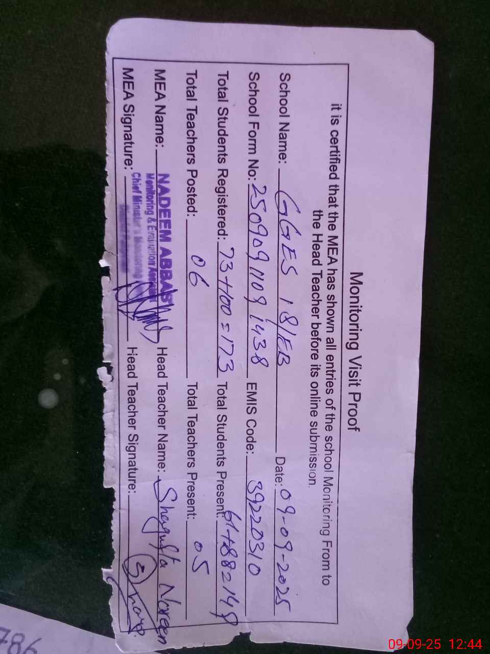 | Attendance Register | Head Teacher | MEA with School | Visit Proof |
