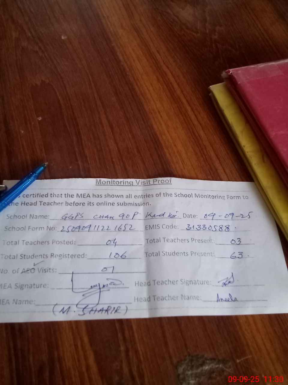| Attendance Register | Head Teacher | MEA with School | Visit Proof |