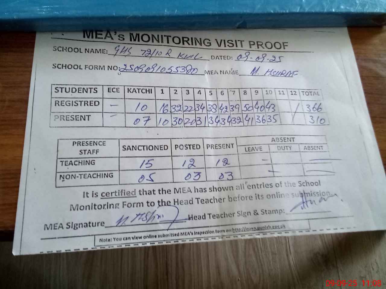 | Attendance Register | Head Teacher | MEA with School | Visit Proof |