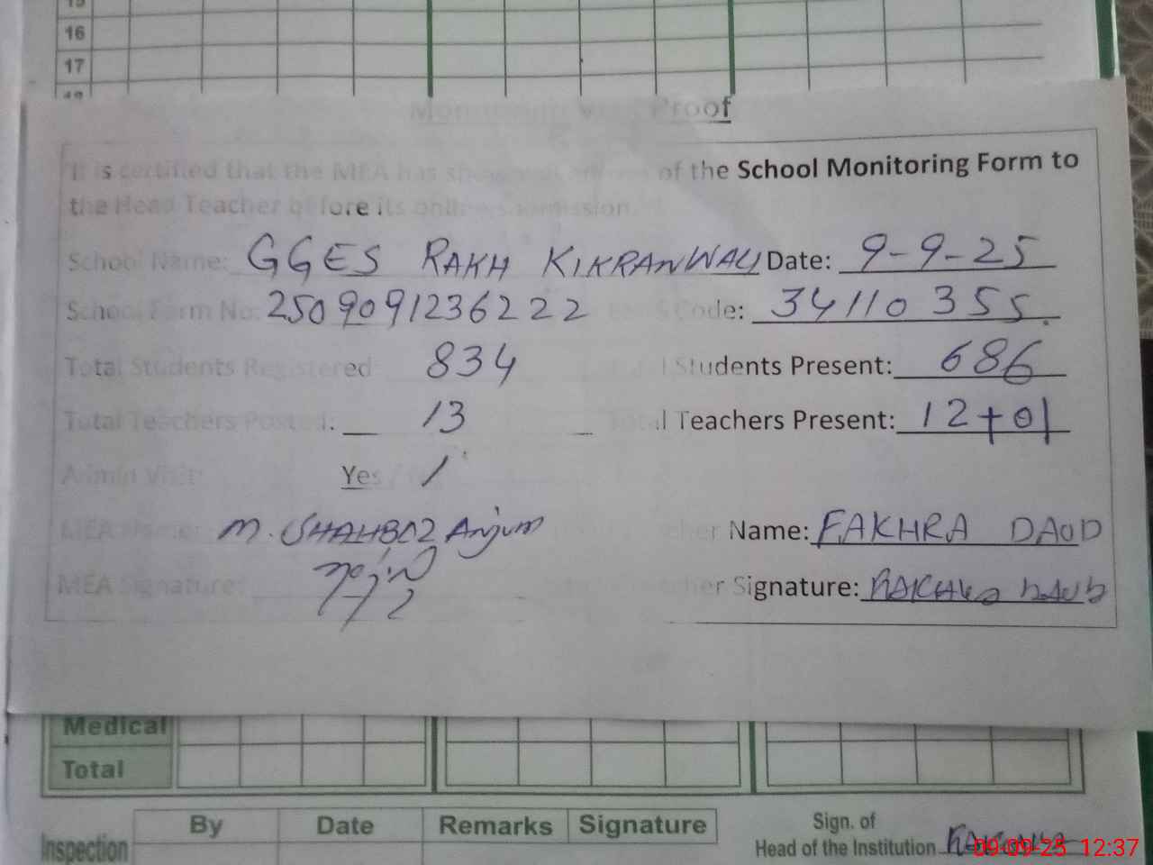 | Certified that this School was Inspected by the Undersigned MEA/DMO Today and the Information Stated Above is as Per Record. | |||||