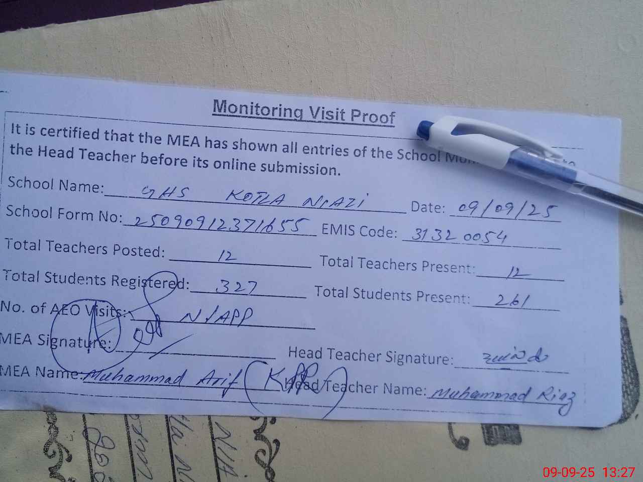 | Attendance Register | Head Teacher | MEA with School | Visit Proof |
