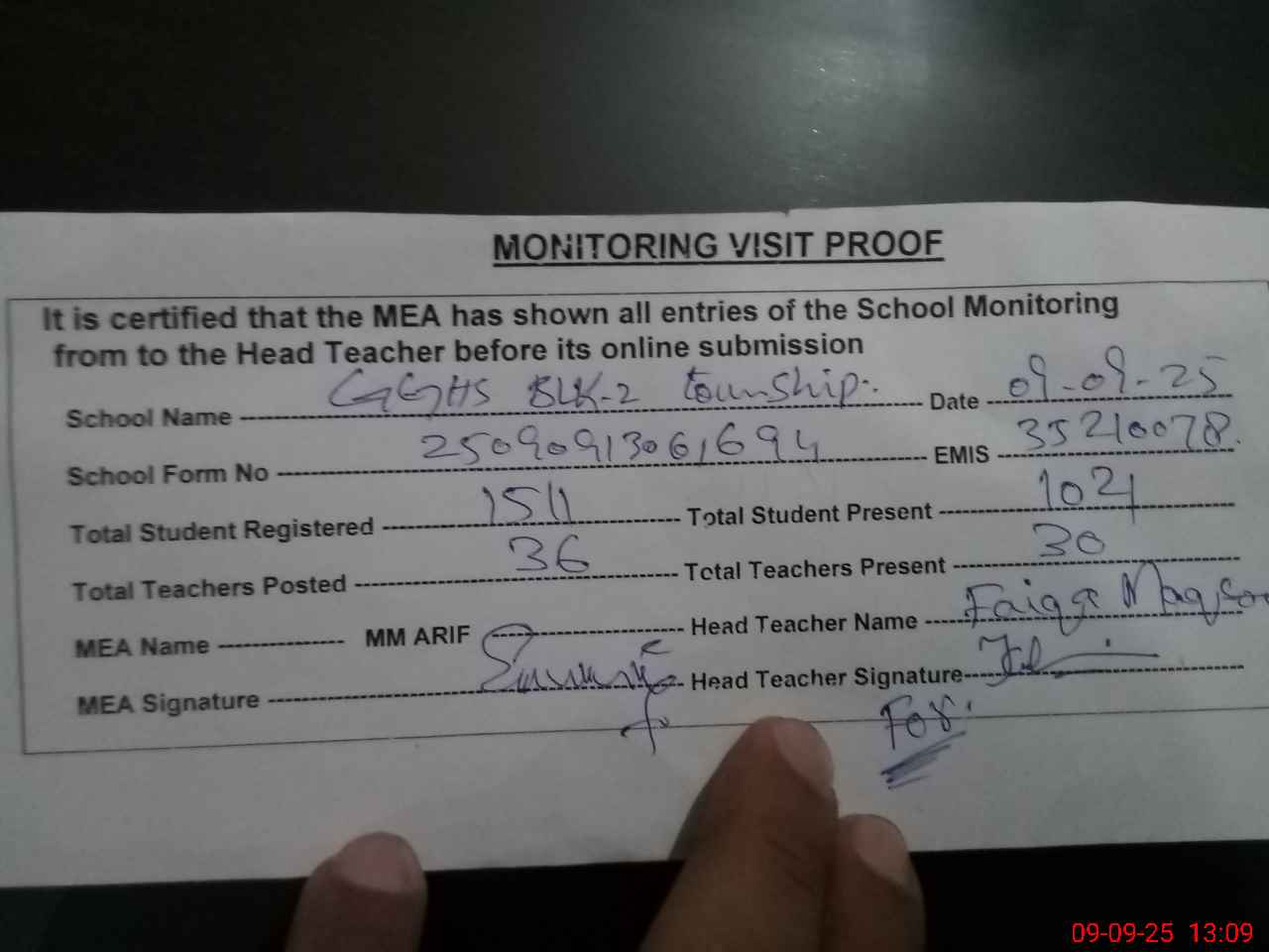| Attendance Register | Head Teacher | MEA with School | Visit Proof |