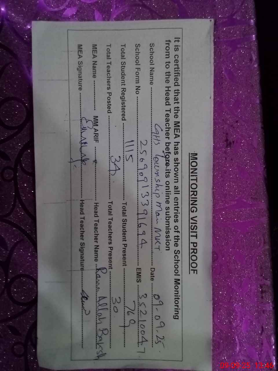 | Certified that this School was Inspected by the Undersigned MEA/DMO Today and the Information Stated Above is as Per Record. | |||||