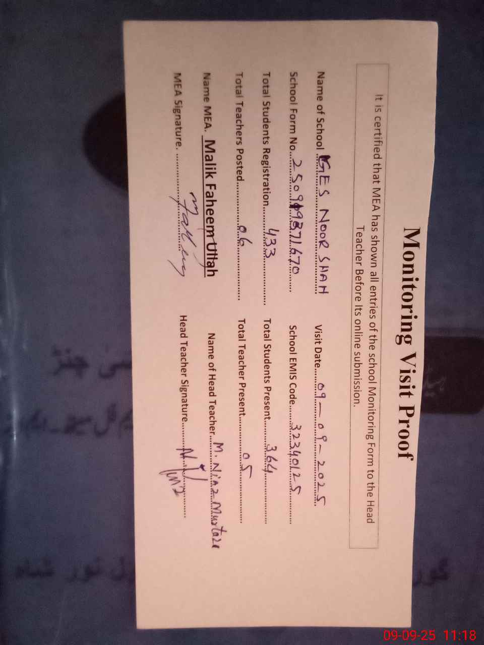 | Attendance Register | Head Teacher | MEA with School | Visit Proof |