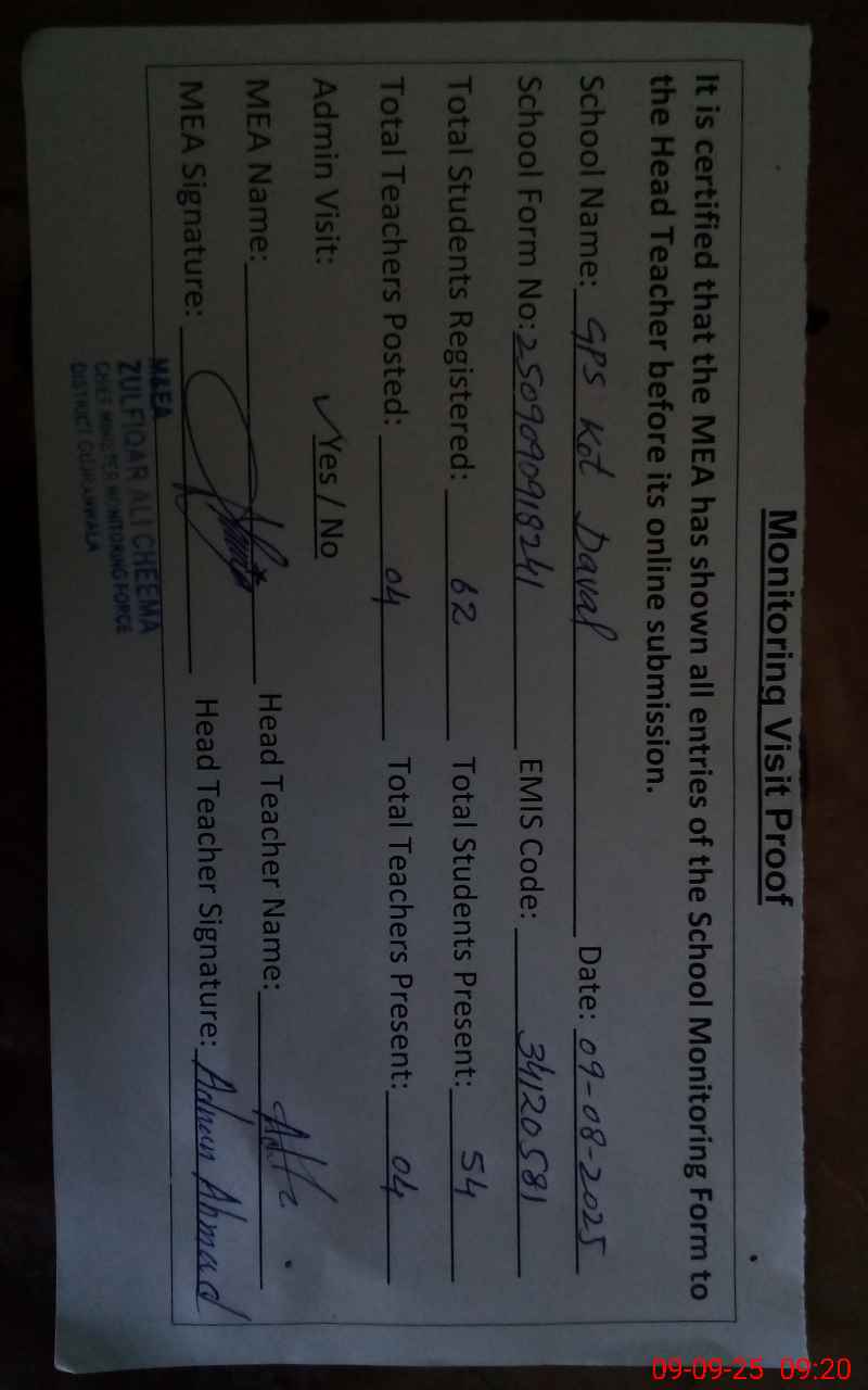 | EMIS Code: 34120581 | Name of School: GPS KOT DAVAL | |||
