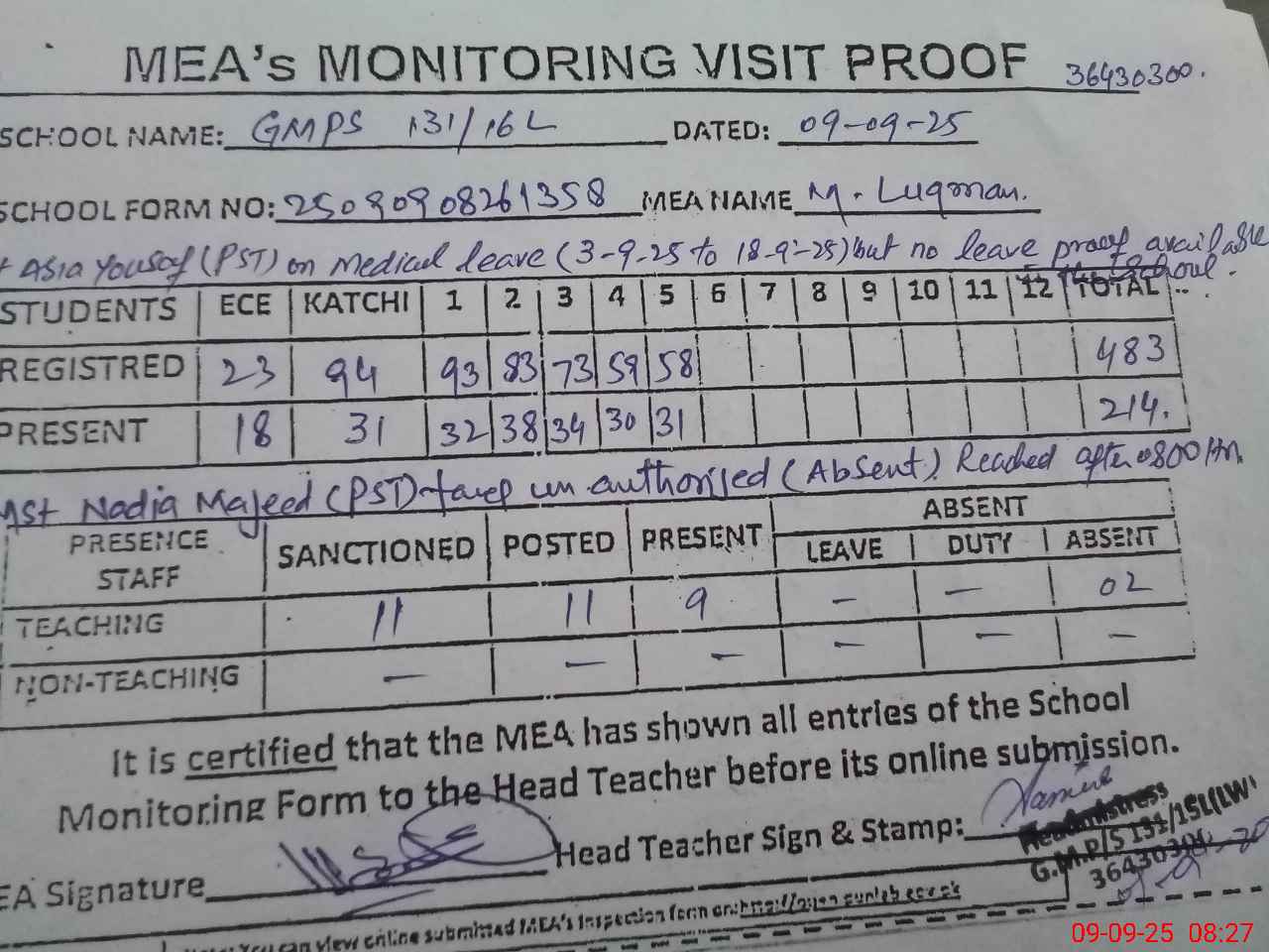| Attendance Register | Head Teacher | MEA with School | Visit Proof |