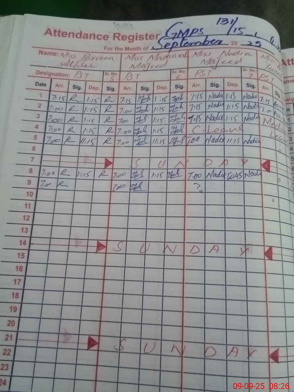 | Remarks (Use Separate Page if Required): Nadia Majeed PST reached after 0800hrs Asia yousaf PST medical leave was not applied | |||||