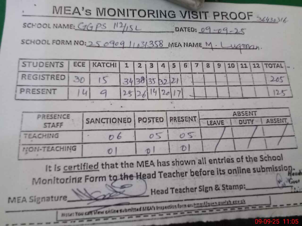| Attendance Register | Head Teacher | MEA with School | Visit Proof |