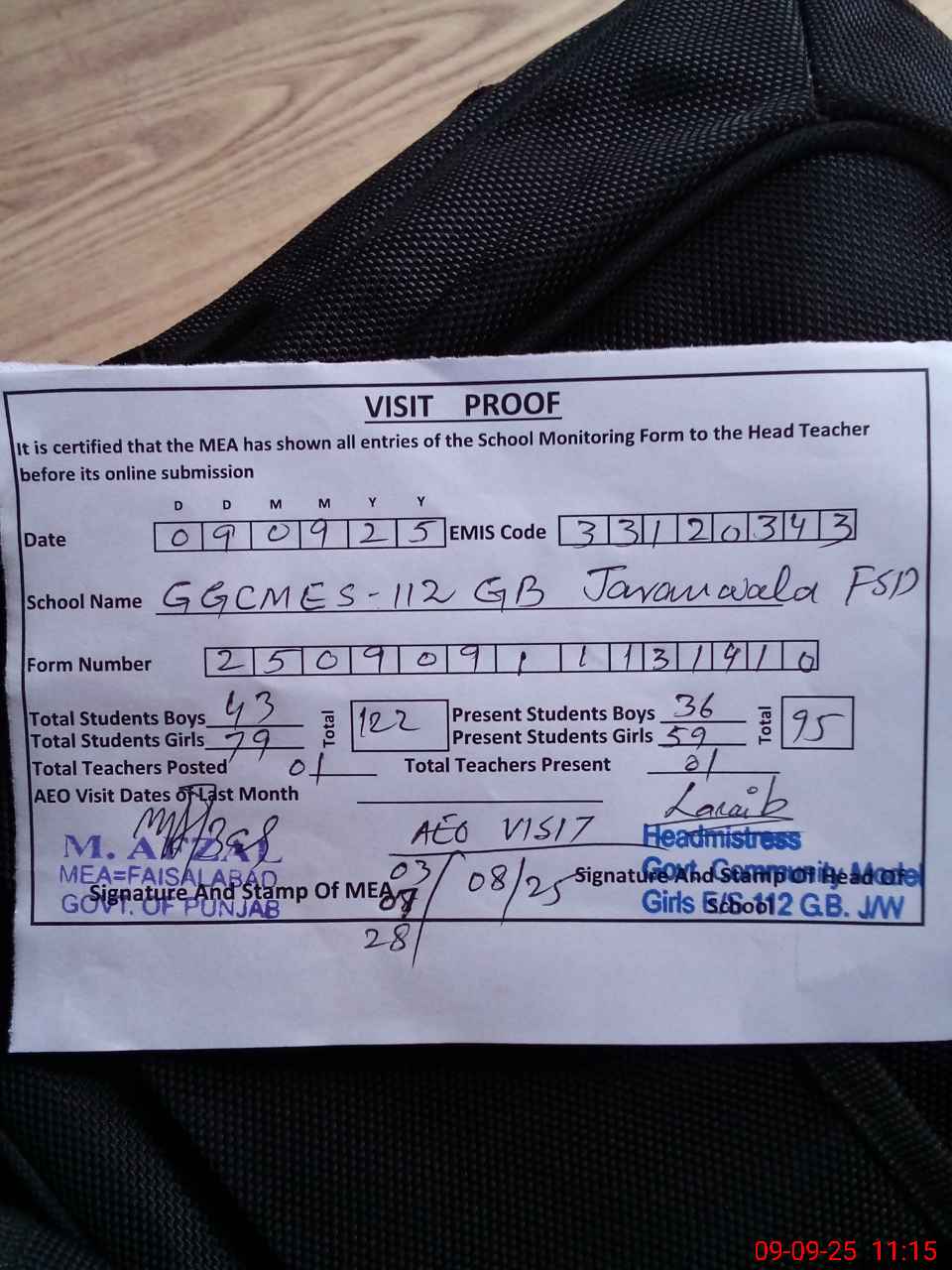 | EMIS Code: 33120343 | Name of School: GGCMES CHAK 112 GB JARANWALA | |||