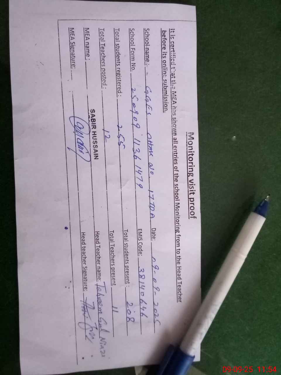| Attendance Register | Head Teacher | MEA with School | Visit Proof |