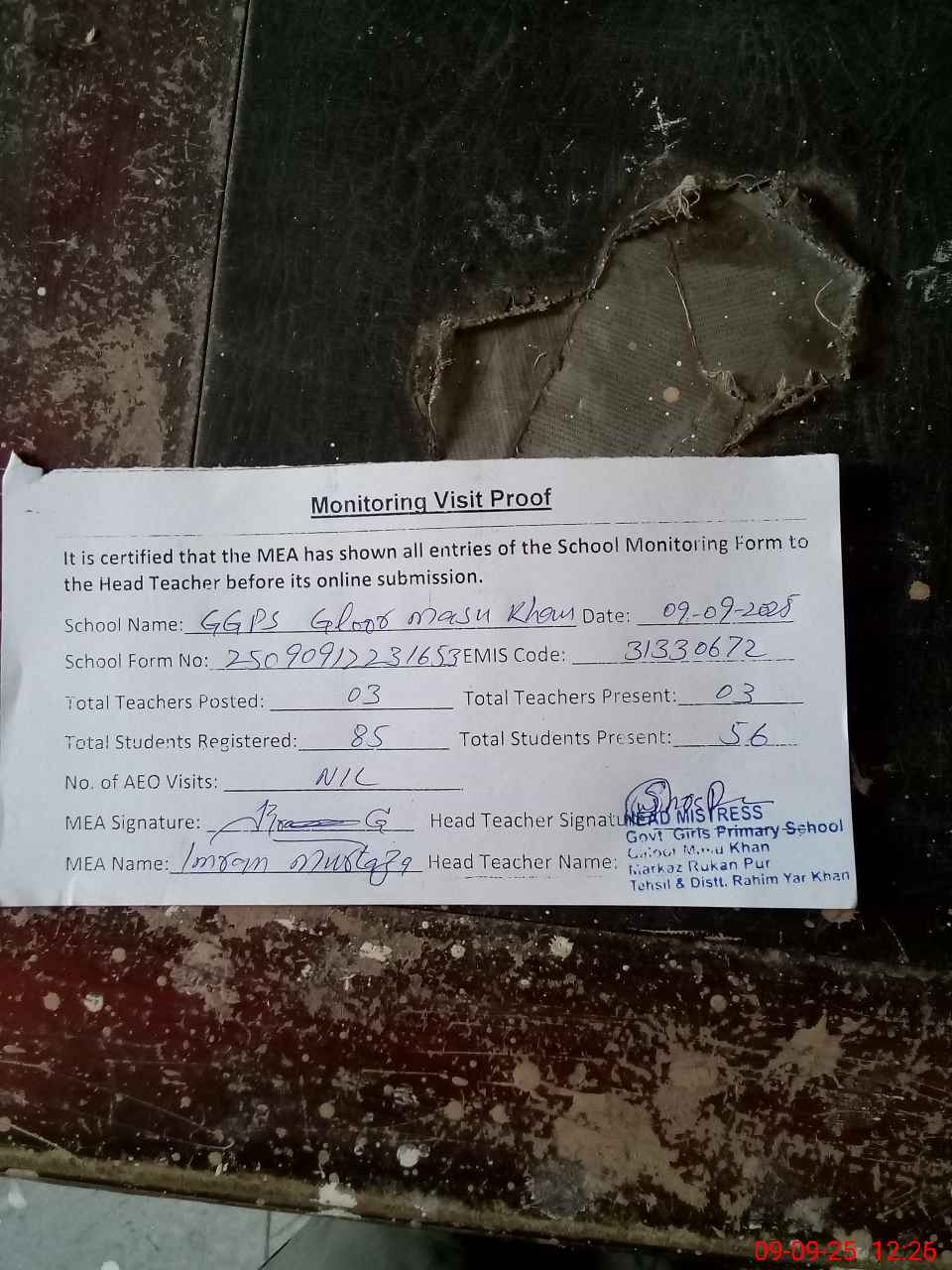 | Attendance Register | Head Teacher | MEA with School | Visit Proof |