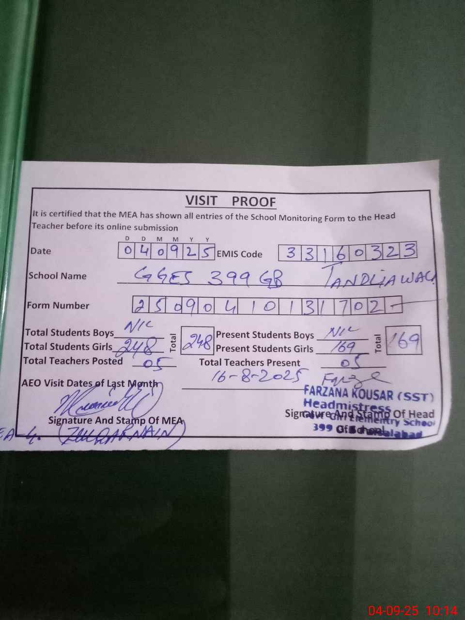 | Attendance Register | Head Teacher | MEA with School | Visit Proof |