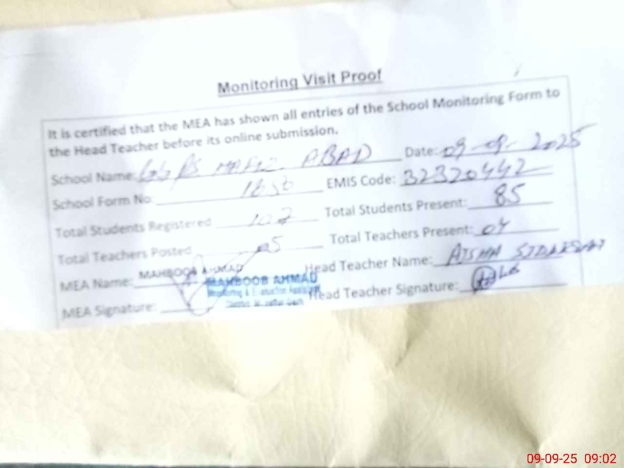 | Monitoring Date: 09-09-2025 | Start Time: 09-09-2025 08:06 AM | End Time: 09-09-2025 09:04 AM | Name of MEA: MA**** AH**** | |