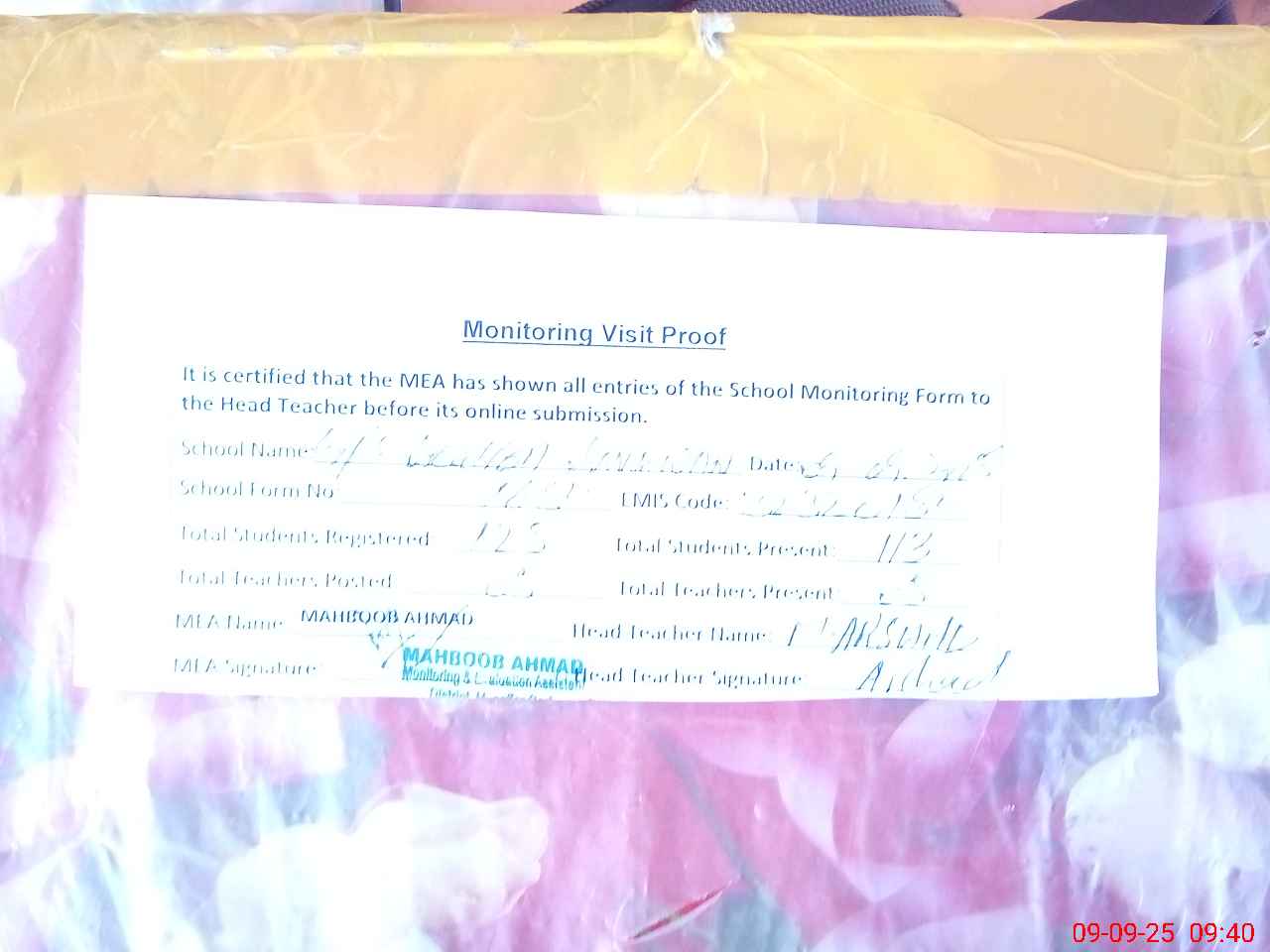 | Attendance Register | Head Teacher | MEA with School | Visit Proof |