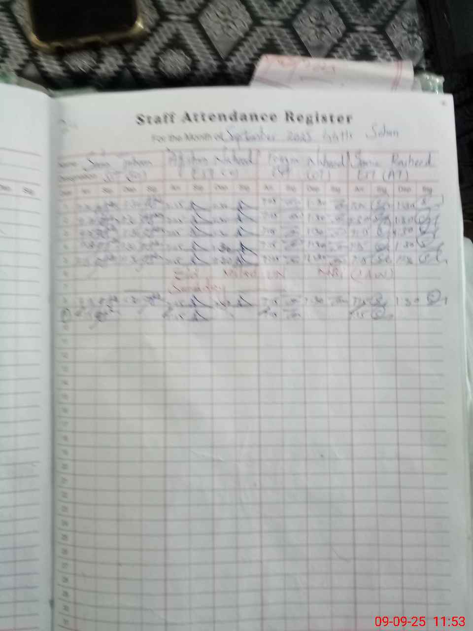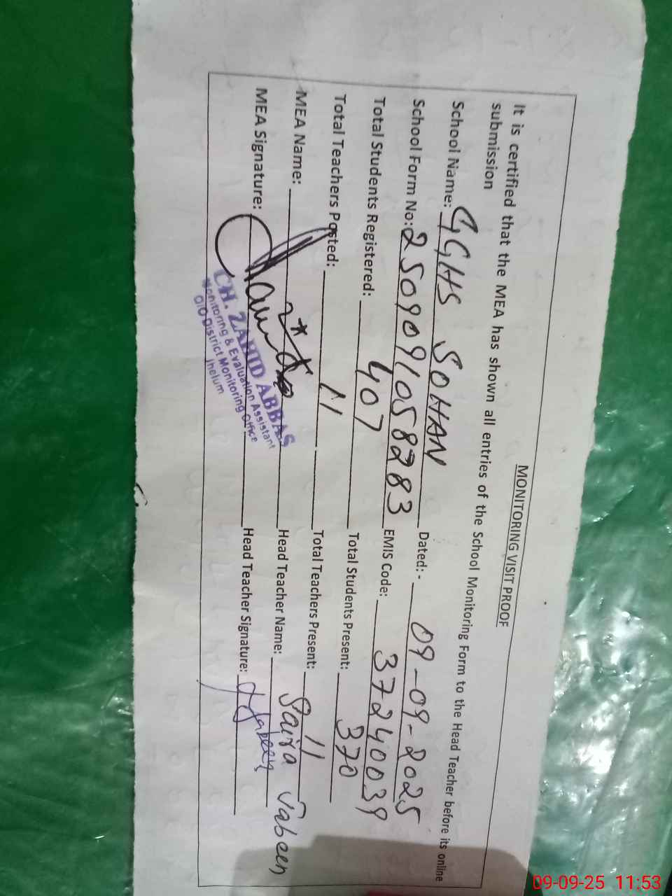 | Monitoring Date: 09-09-2025 | Start Time: 09-09-2025 10:58 AM | End Time: 09-09-2025 11:56 AM | Name of MEA: Za**** Ab**** | |