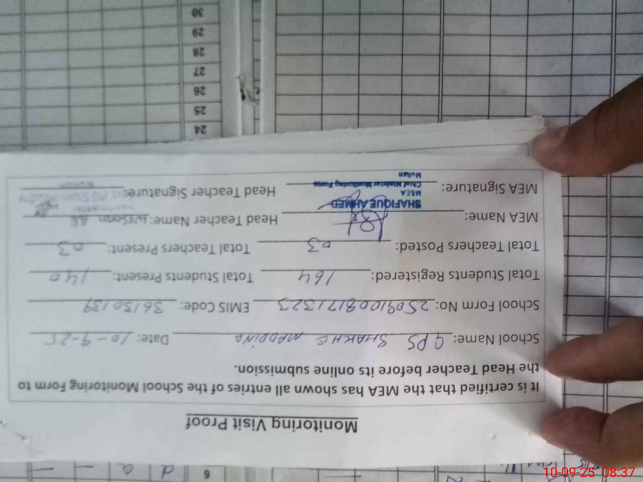 | Attendance Register | Head Teacher | MEA with School | Visit Proof |