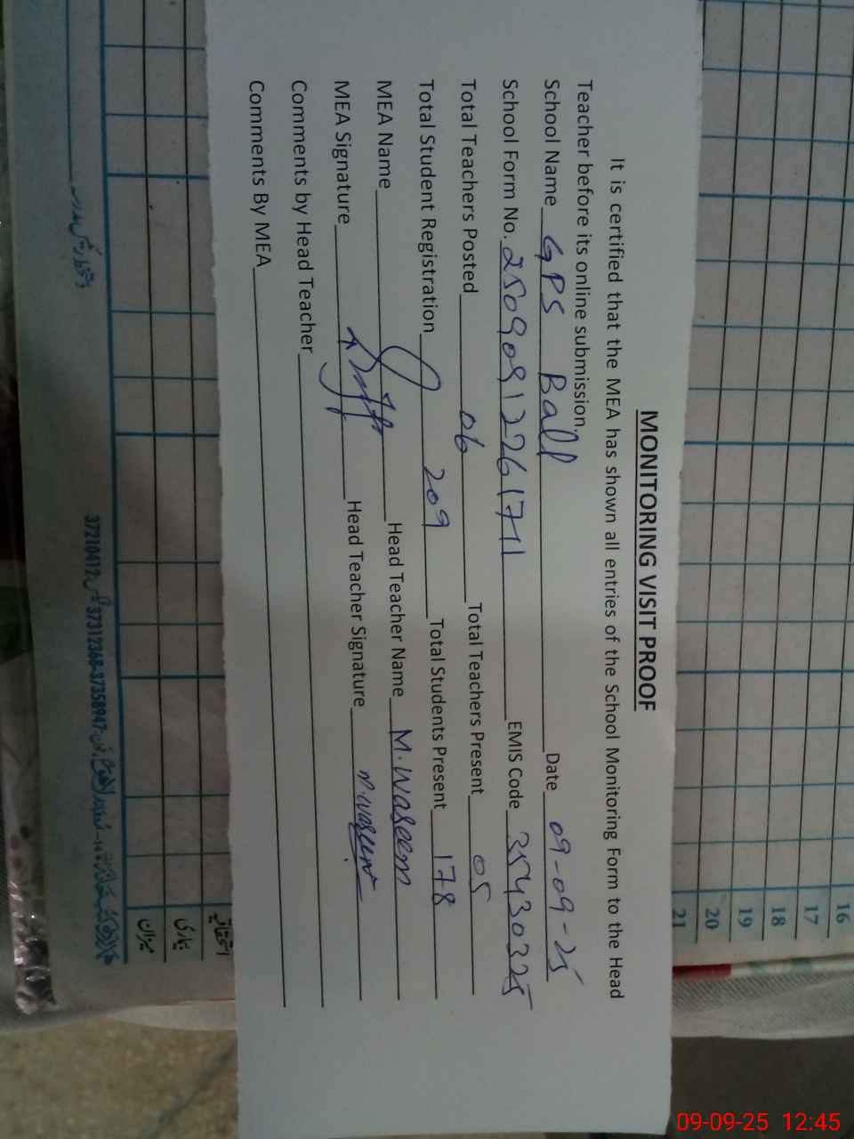 | Attendance Register | Head Teacher | MEA with School | Visit Proof |