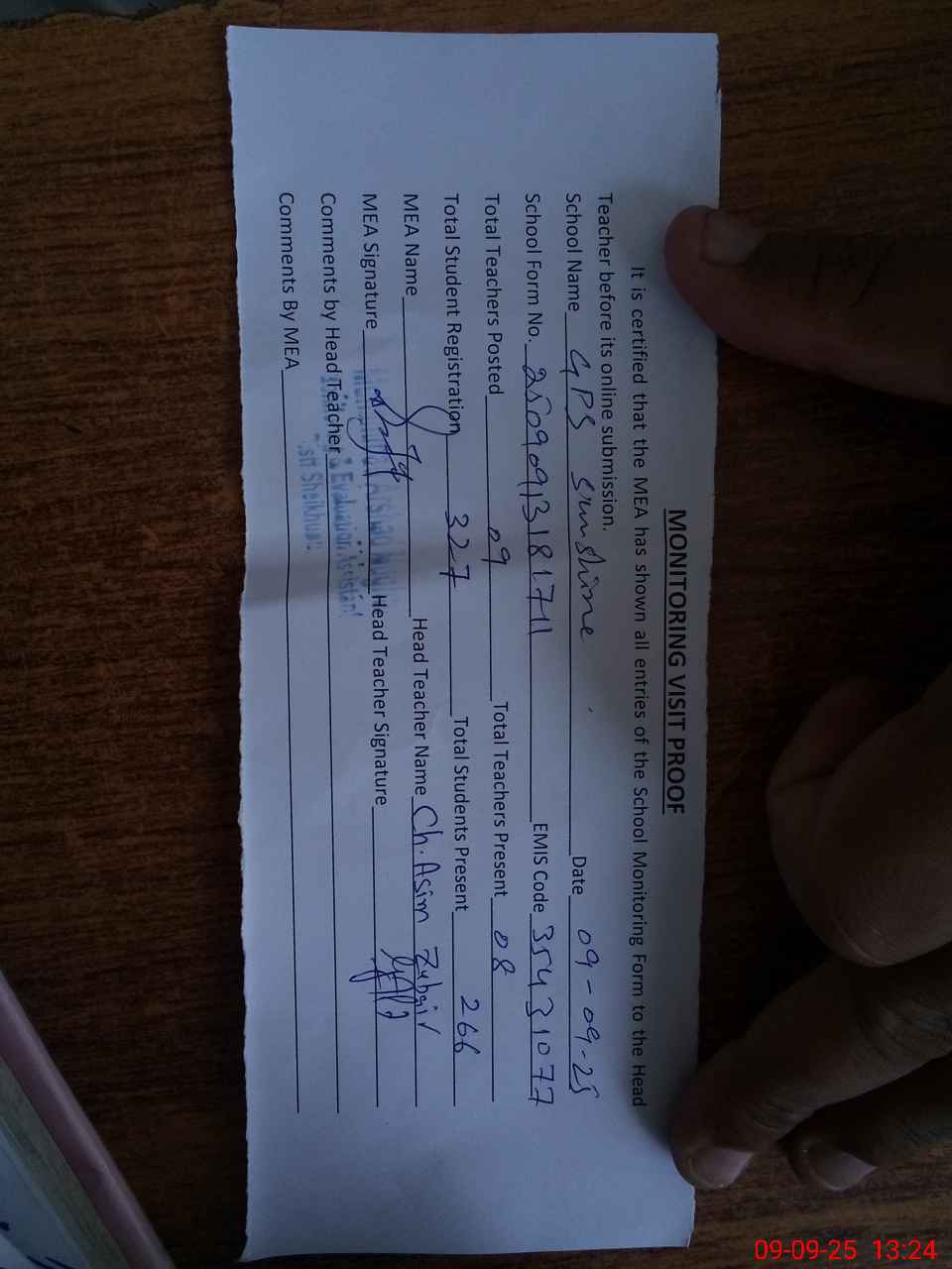 | Attendance Register | Head Teacher | MEA with School | Visit Proof |