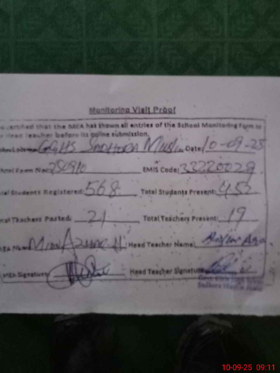 | Attendance Register | Head Teacher | MEA with School | Visit Proof |