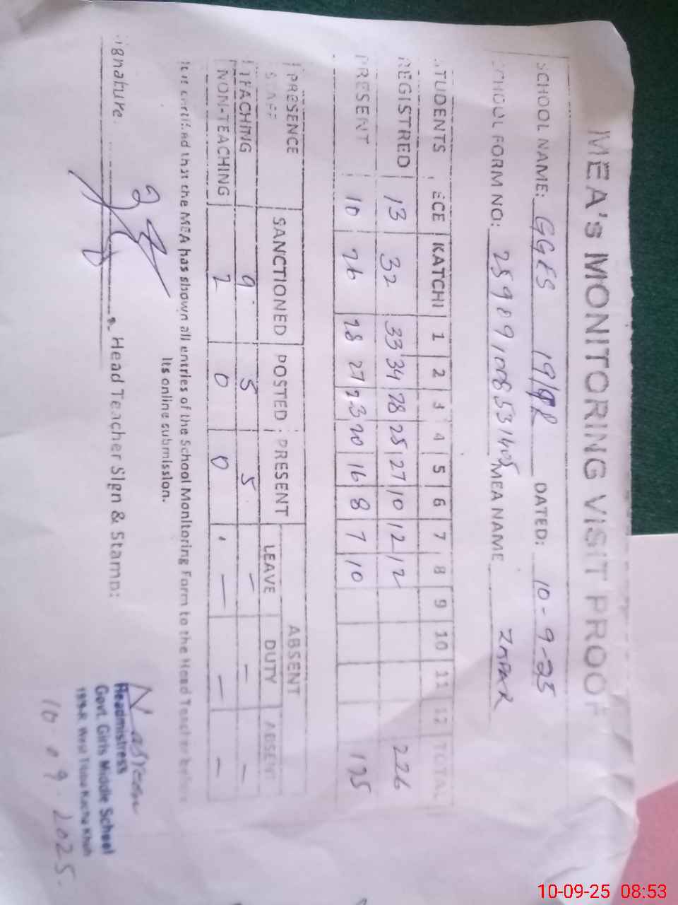 | Attendance Register | Head Teacher | MEA with School | Visit Proof |