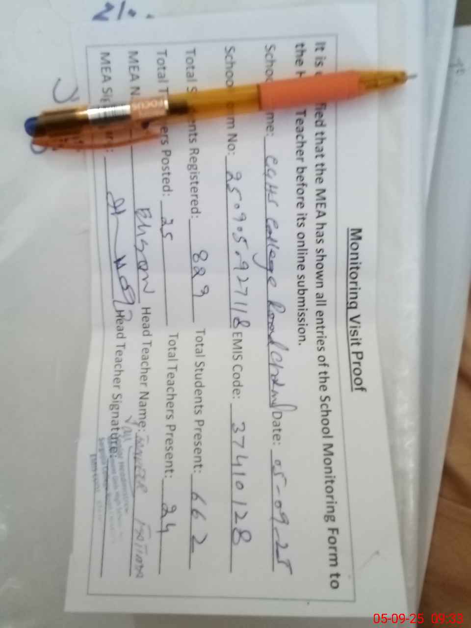| Attendance Register | Head Teacher | MEA with School | Visit Proof |