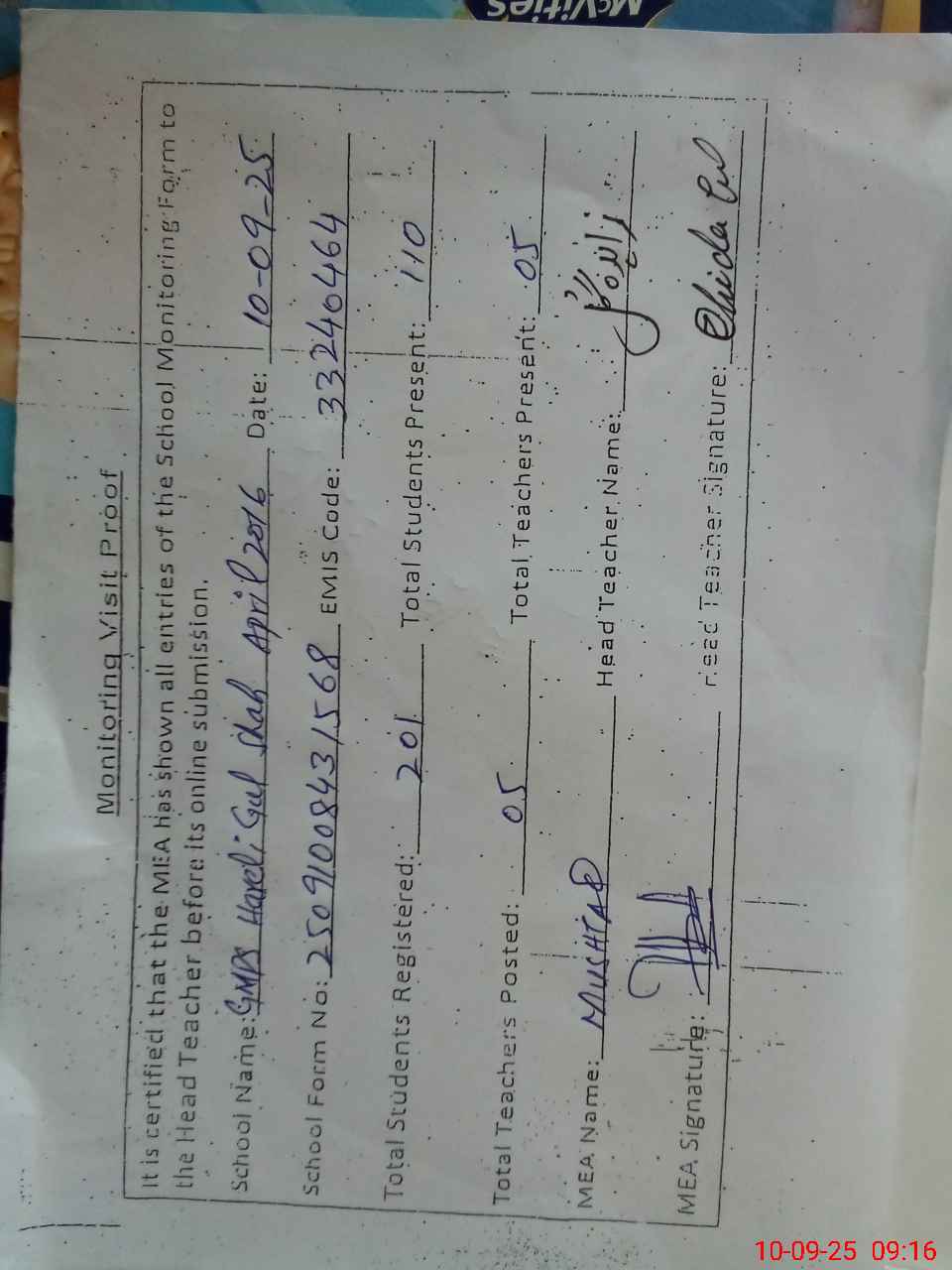 | EMIS Code: 33240464 | Name of School: GMPS Haveli Gul Shah (April-2016) | |||