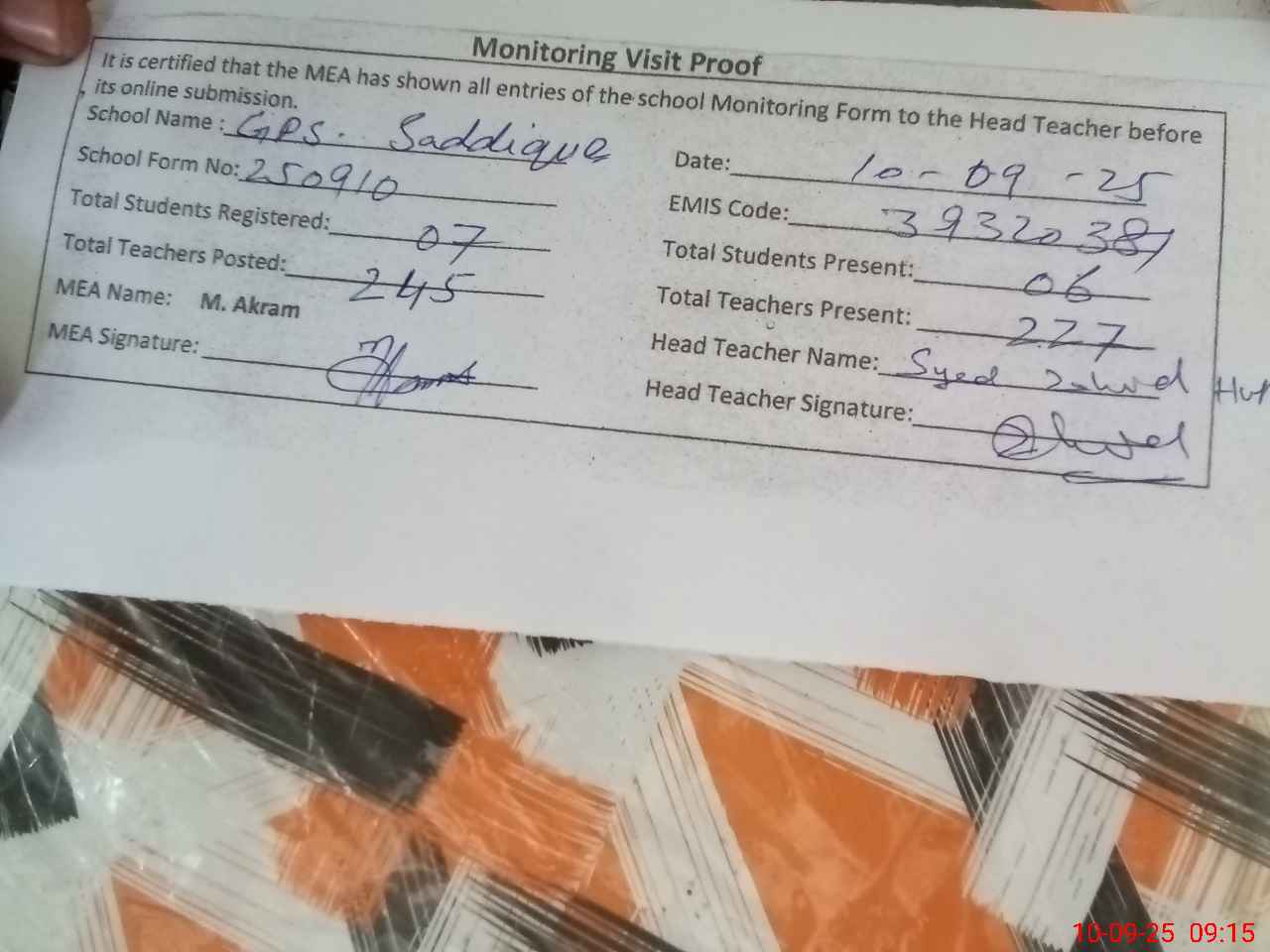 | Monitoring Date: 10-09-2025 | Start Time: 10-09-2025 08:46 AM | End Time: 10-09-2025 09:20 AM | Name of MEA: MU**** AK**** (R**** | |