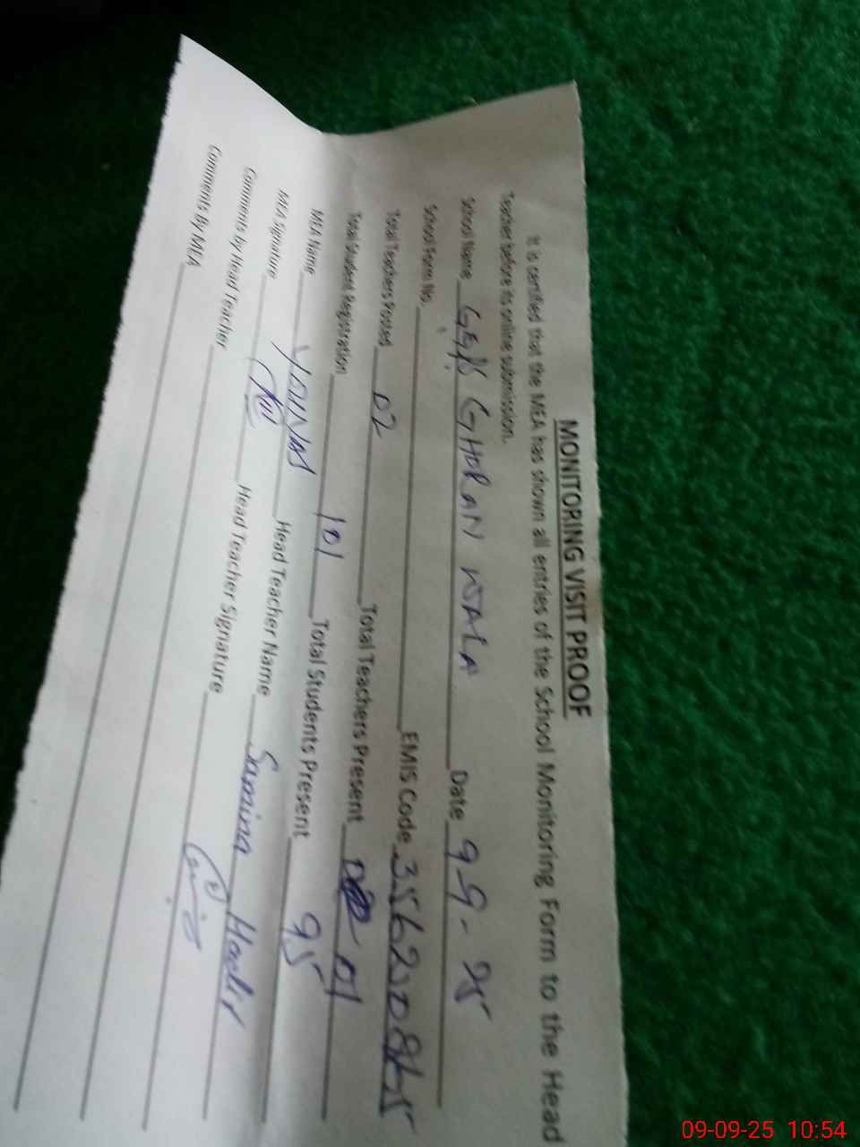 | Attendance Register | Head Teacher | MEA with School | Visit Proof |