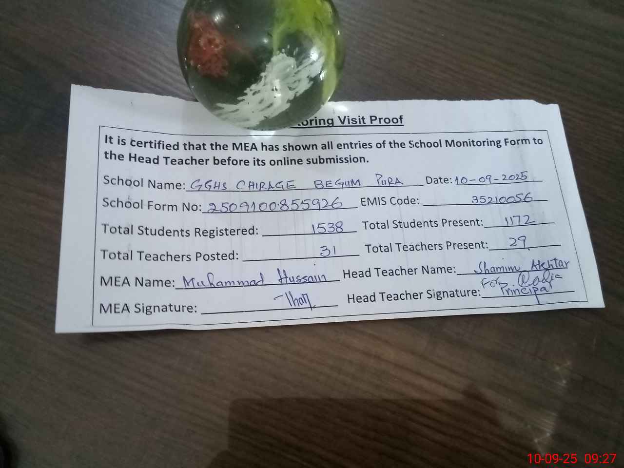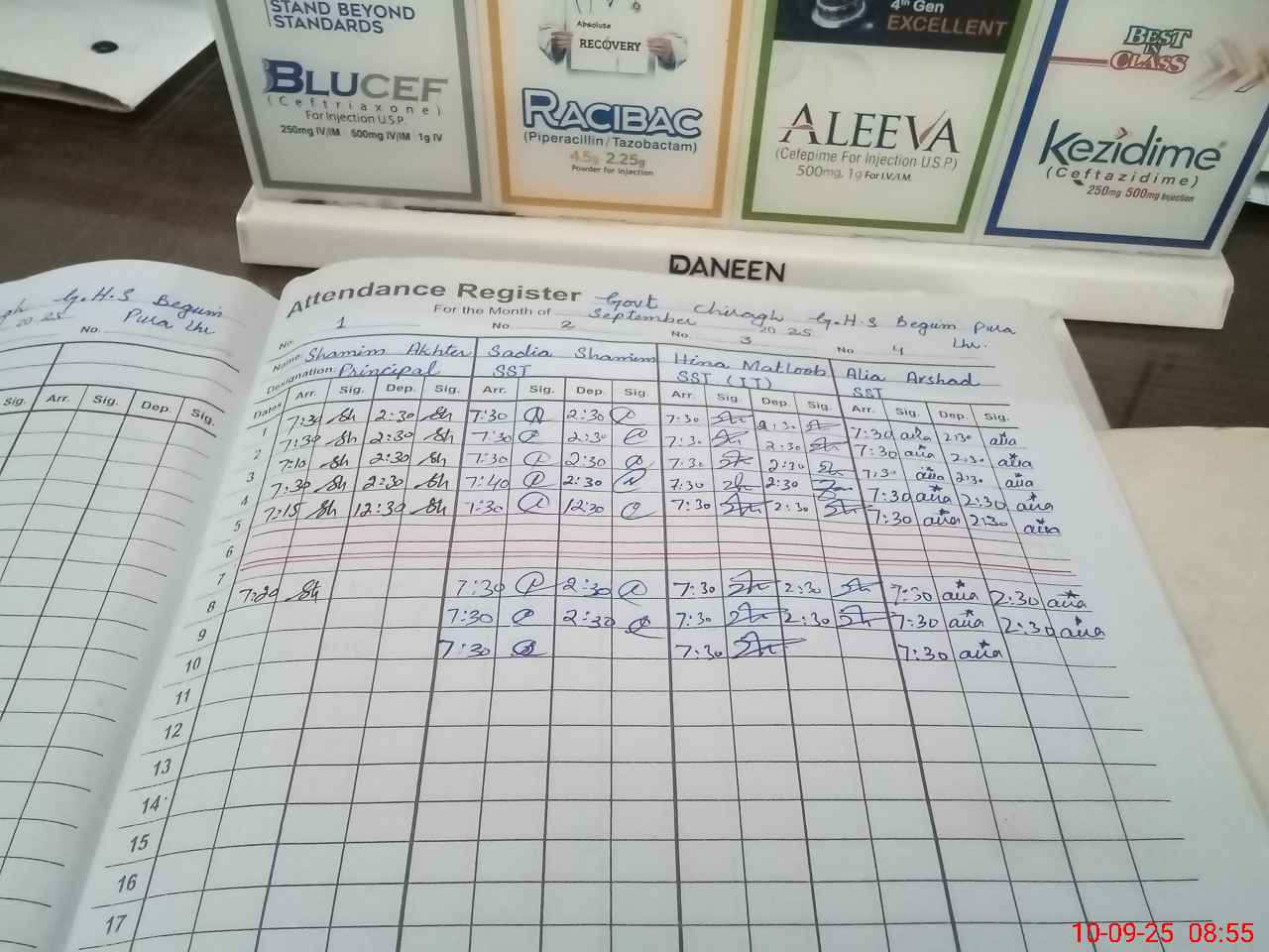 | Remarks (Use Separate Page if Required): 1 I reached at school at about 0835 hrs the principal of the school was not present in school her attendece column blank of previous date 9th September 2025 and 10th September 2025 and her casual leave of both dates mark after my arrival and leave applied on sis also after my arrival in school 2 One toilet not functional due to repairable 3 NUSRAT JABEEN PET teacher double name I pmiu teacher data list no duplicate name in SIS | |||||