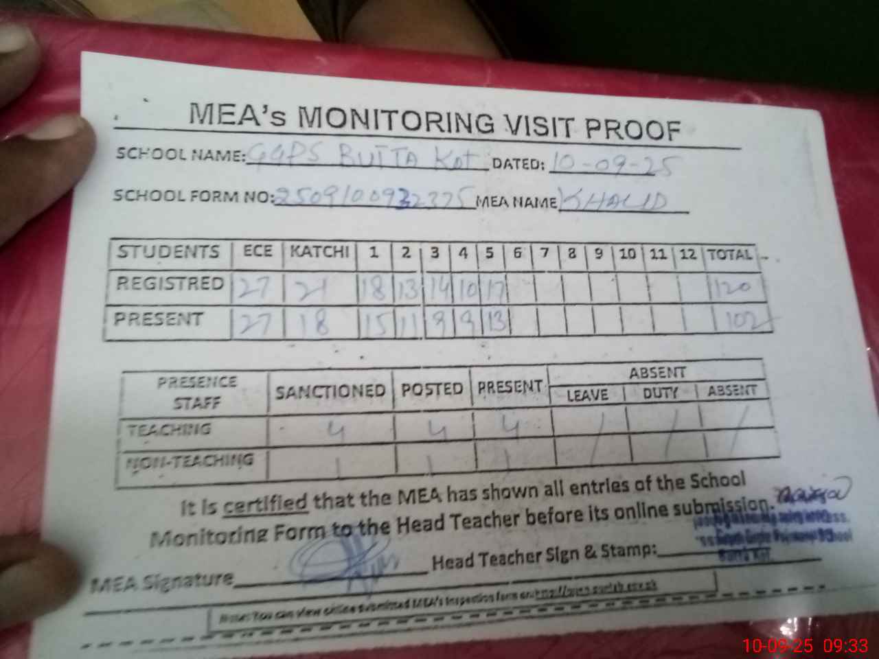 | EMIS Code: 36410375 | Name of School: GGPS BUTTA KOT, KABIRWALA | |||