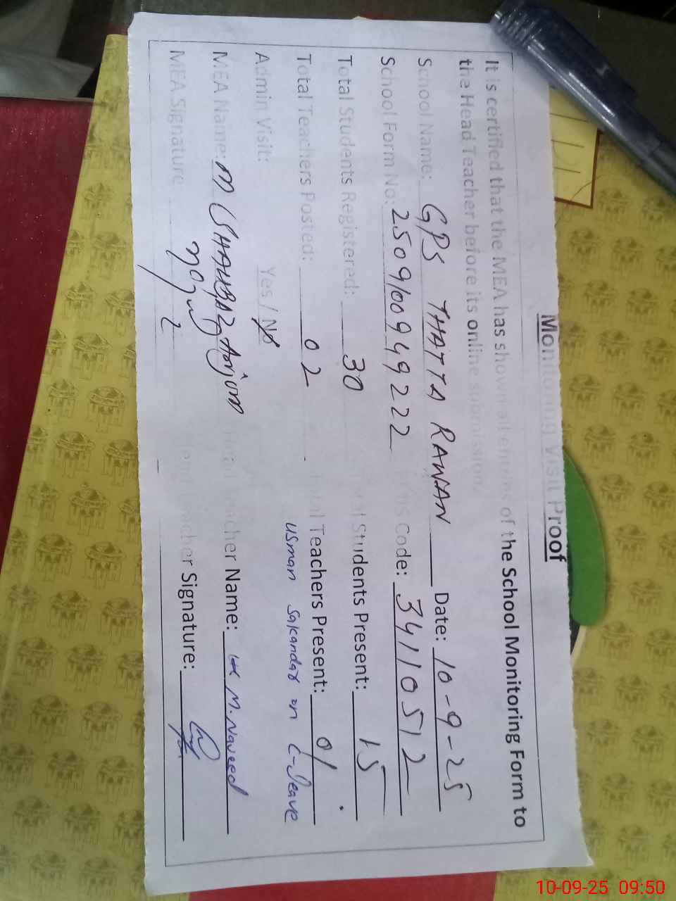| Attendance Register | Head Teacher | MEA with School | Visit Proof |