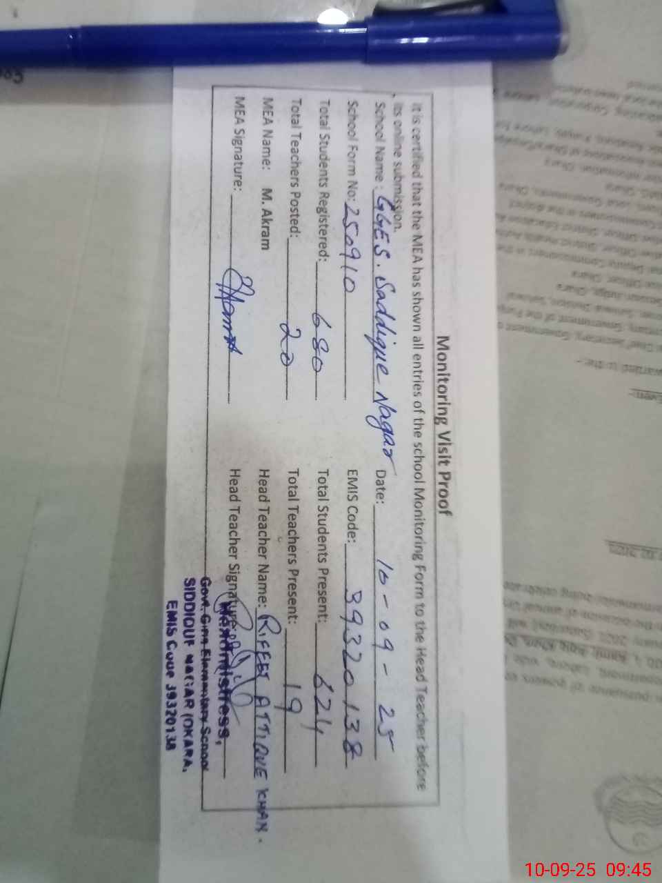 | Attendance Register | Head Teacher | MEA with School | Visit Proof |