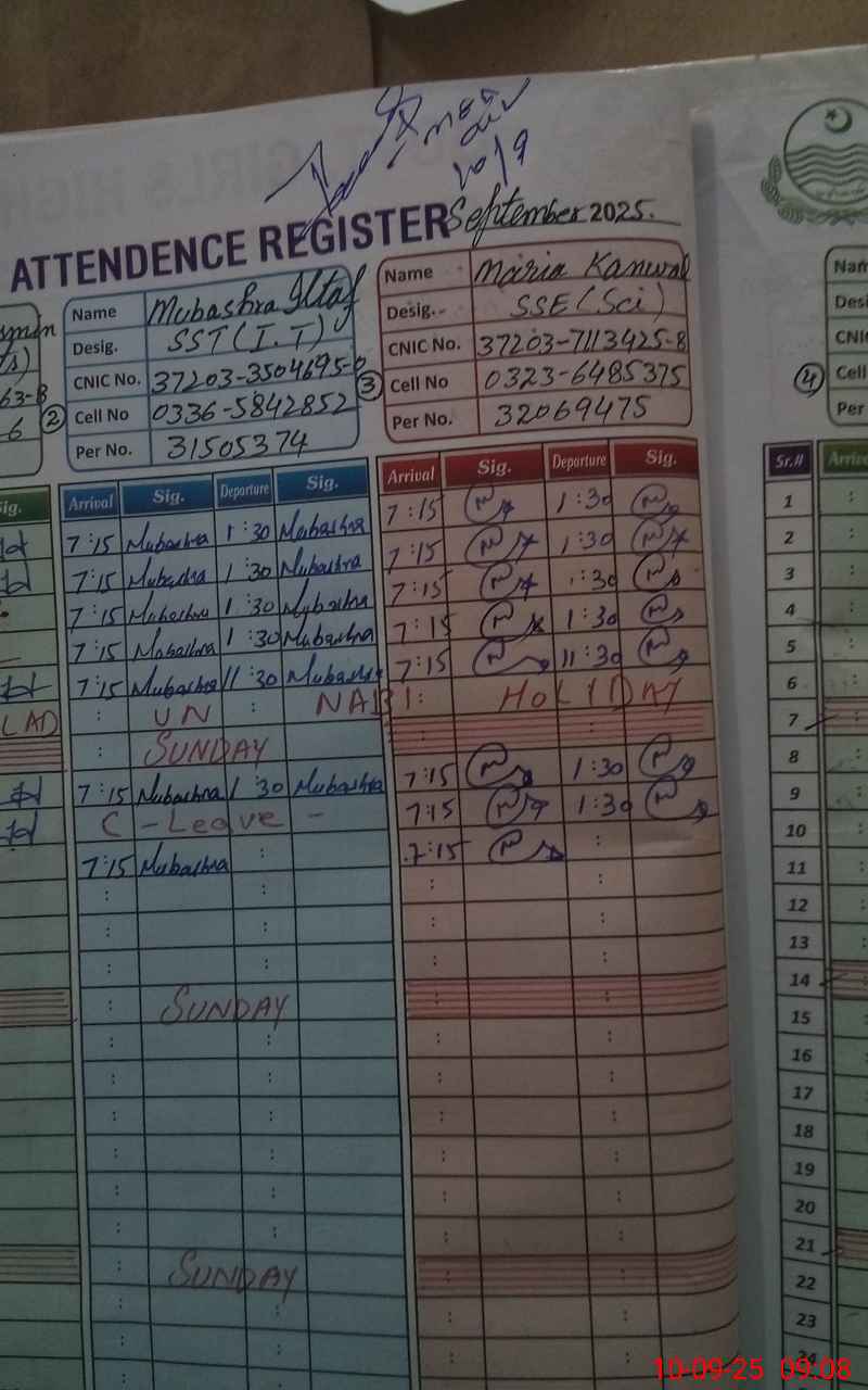 | CNIC | Full Name | Designation | R/C | Absence During Last Calender Month |