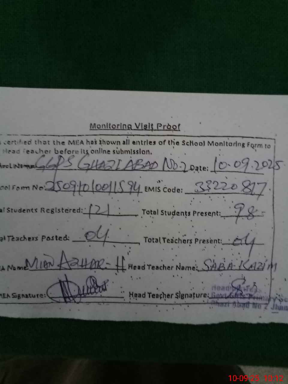 | Monitoring Date: 10-09-2025 | Start Time: 10-09-2025 09:29 AM | End Time: 10-09-2025 10:12 AM | Name of MEA: J-**** AZ**** HU**** | |