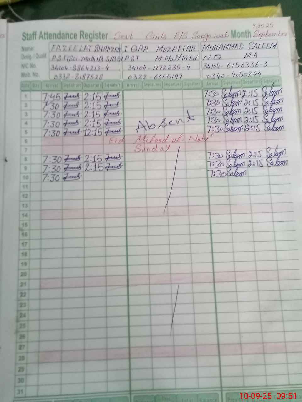 | CNIC | Full Name | Designation | R/C | Absence during last cal. month |