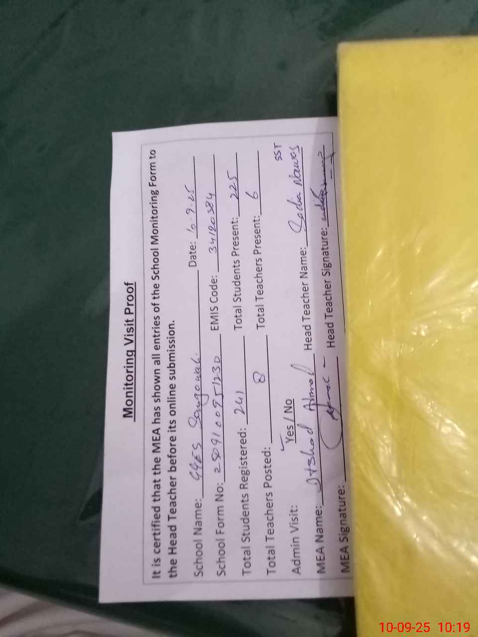 | Attendance Register | Head Teacher | MEA with School | Visit Proof |