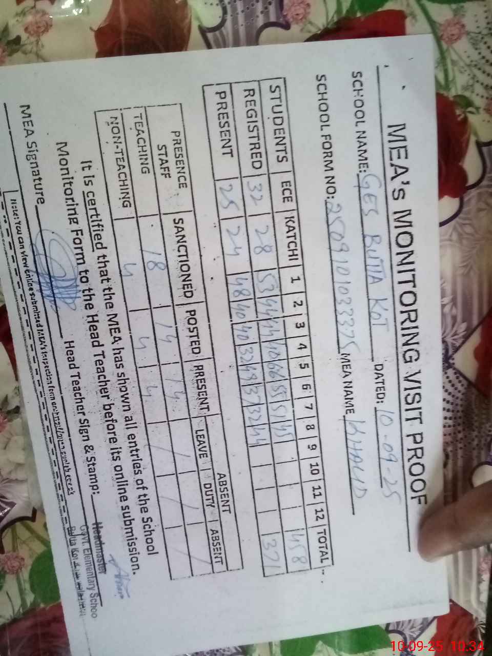 | Attendance Register | Head Teacher | MEA with School | Visit Proof |