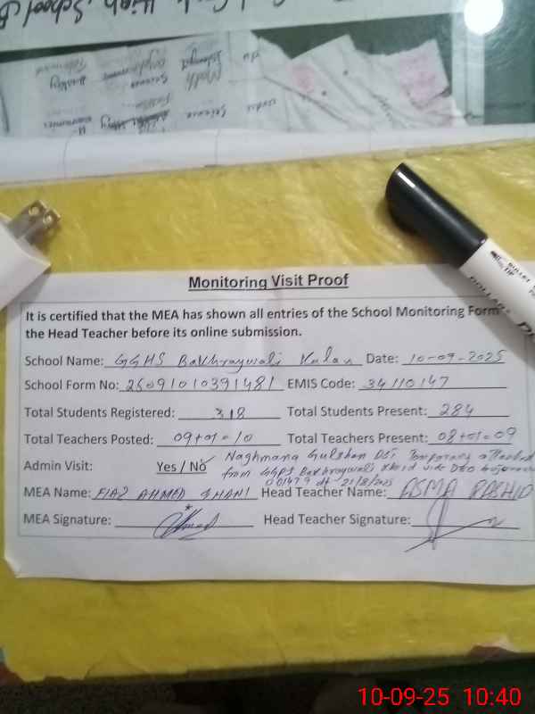 | Remarks (Use Separate Page if Required): Attendance of teaching staff and students on SIS Software is not updated at the time of visit Naghmana Gulshan PST temporary attached from GGPS Bakhraywali Khurd vide DEO Gujranwala Office Order No 1479 DEO dated 21 August 2025 Data as per provided by School Staff and found during physical visit | |||||