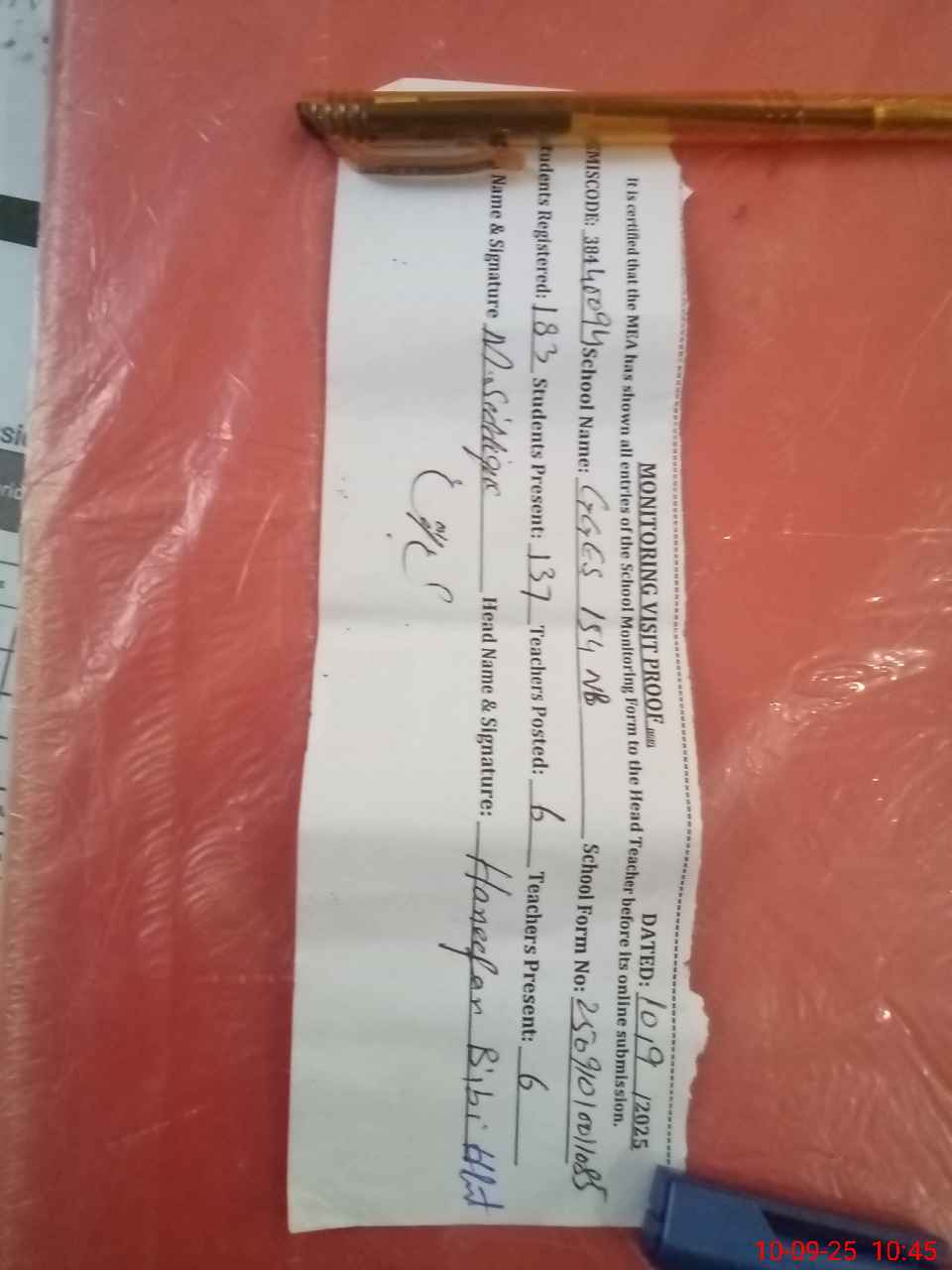 | Attendance Register | Head Teacher | MEA with School | Visit Proof |
